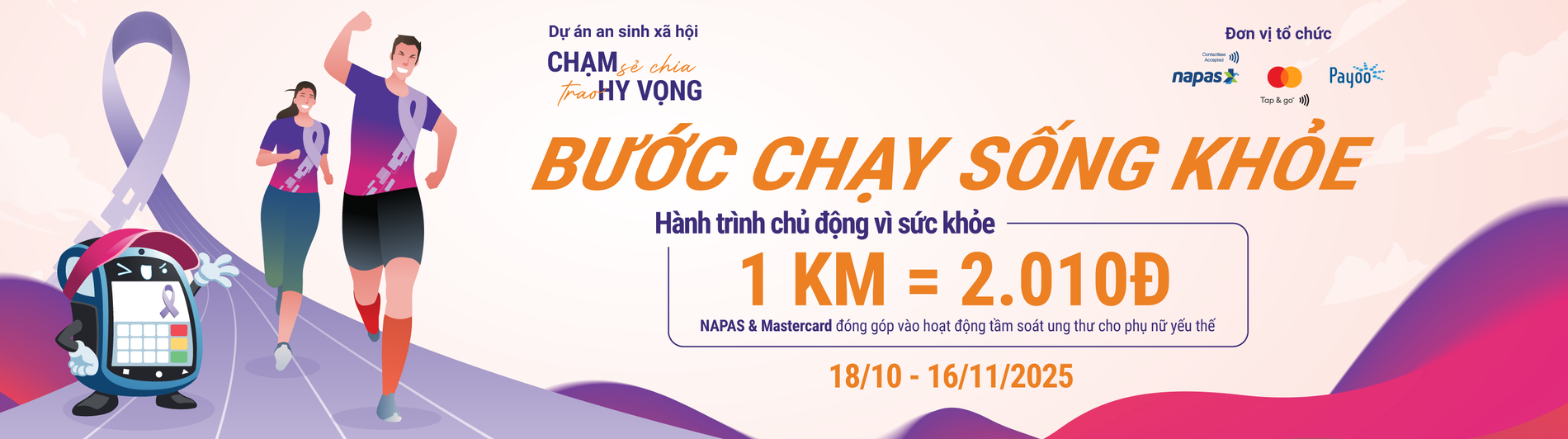 - Giải chạy mang thông điệp khuyến khích lối sống tích cực trong cộng đồng và lan tỏa yêu thương đến phụ nữ Việt Nam. Mỗi bước chạy của người tham gia không chỉ là sự quan tâm đến sức khỏe bản thân mà còn là hành động sẻ chia, tiếp thêm sức mạnh cho những phụ nữ có hoàn cảnh khó khăn. Thông qua từng km tích lũy hợp lệ của người tham gia, hai tổ chức Mastercard & Napas đóng góp 2.010 đồng để tầm soát ung thư miễn phí cho những phụ nữ thụ hưởng của chương trình “Chạm sẻ chia, Trao hy vọng”.